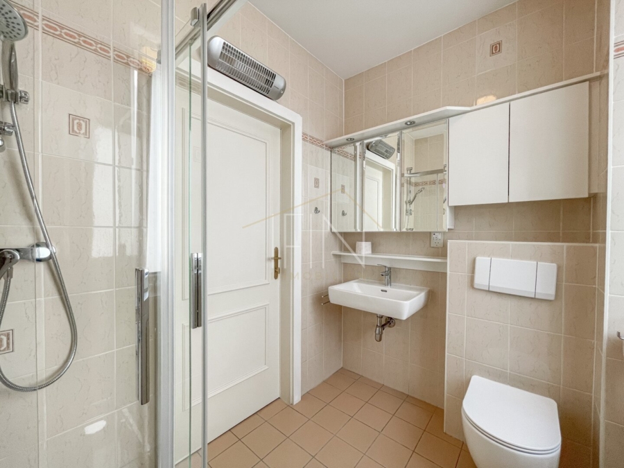 Das separate Badezimmer mit Toilette präsentiert sich gepflegt und komfortabel. Ein praktischer Abstellraum sorgt für Ordnung und zusätzlichen Stauraum.