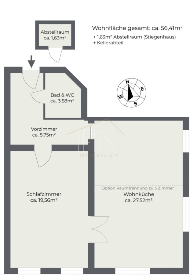 Aktuell ist die Wohnung als großzügiges 2-Zimmer-Domizil gestaltet. Besonders attraktiv für individuelle Ansprüche: Nach Absprache kann eine Zwischenwand samt Tür errichtet werden und die Wohnung effizient in drei Räume gegliedert werden (z.B. zusätzliches Kinderzimmer oder Home-Office).