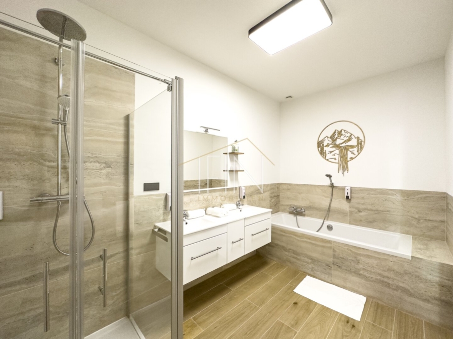 Die Nassräume sind mit großen Fliesen und Qualitätsarmaturen versehen.